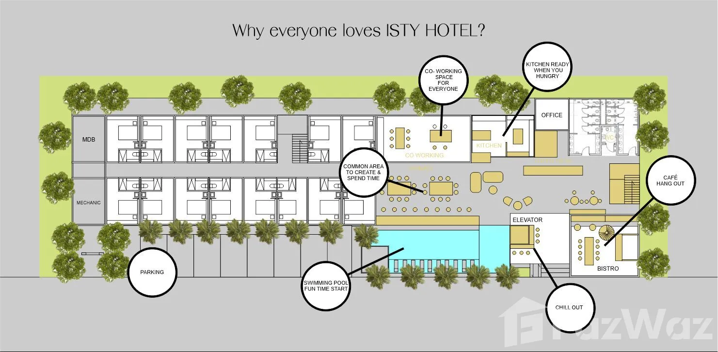 Introducing a prestigious hotel located in the heart of Si Phum, Chiang Mai, crafted for those with a taste for opulence and elegance. This exquisite property, priced at 130,000,000 THB, offers an unparalleled investment opportunity in one of Thailand's most sought-after destinations. The hotel boasts an expansive interior size of 3000sqm, accommodating 62 bedrooms and 66 bathrooms, spread across four floors. Elegance and Comfort The hotel's modern architecture features a sleek, multi-story structure with large glass windows that accentuate a seamless blend of indoor and outdoor spaces. Guests are greeted with a stylish reception area adorned with a marble countertop and contemporary design elements. The expansive common areas, featuring wooden flooring and contemporary lighting, invite relaxation and social interaction. Luxurious Amenities Experience ultimate leisure with a rooftop terrace that includes a bar area, ample seating, and scenic nighttime views. The property also offers a swimming pool surrounded by lounge chairs, providing a serene escape. Dining options include a cozy seating area and a cafe lounge with a warm, inviting atmosphere.