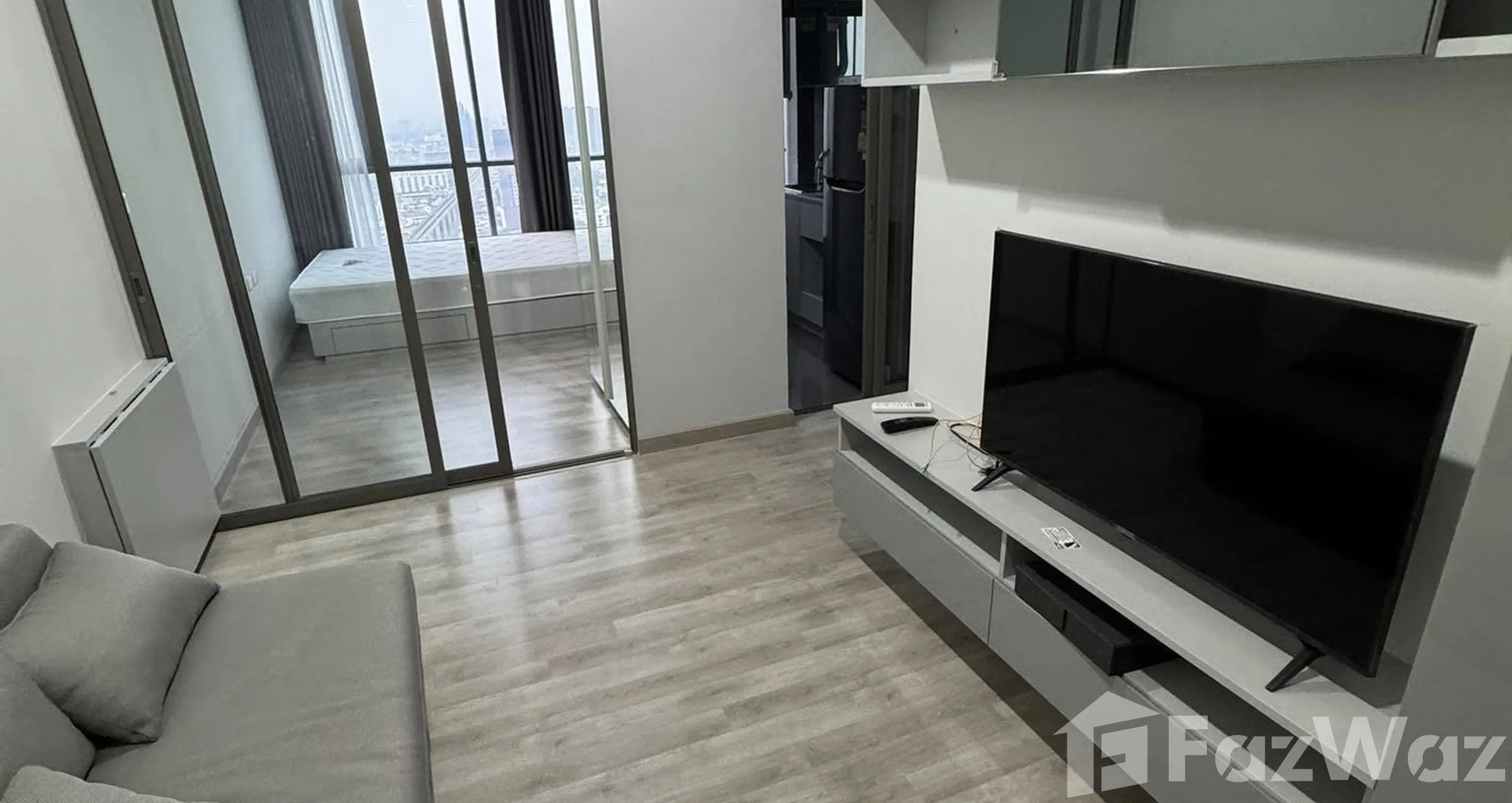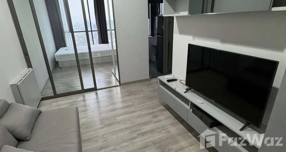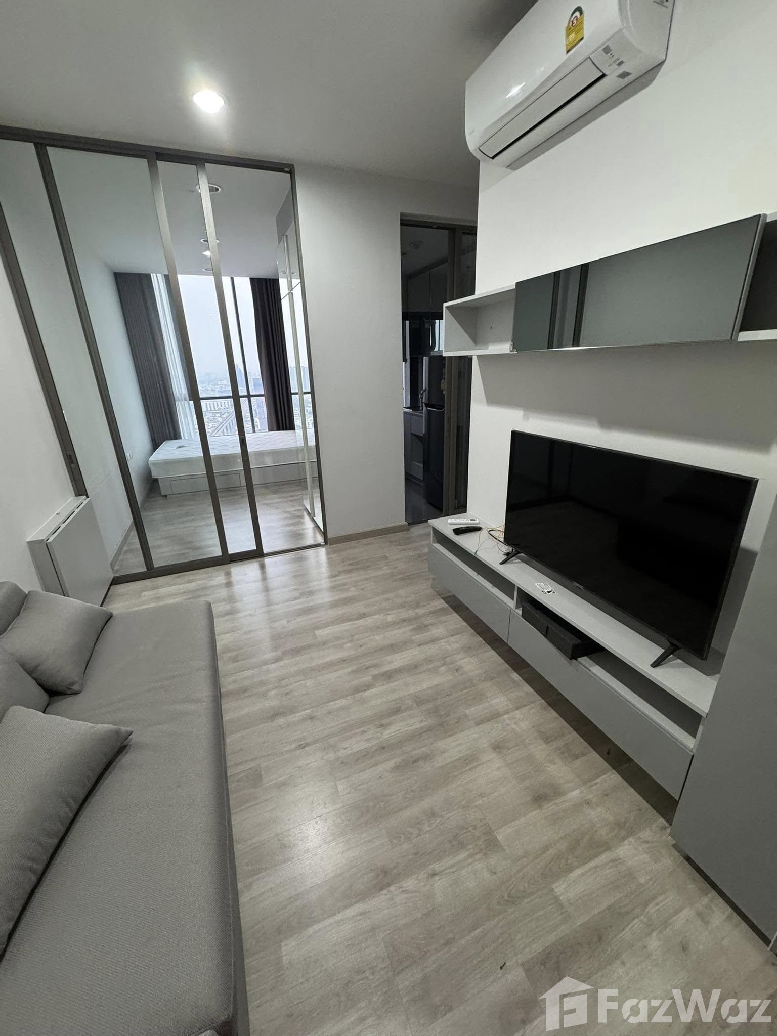 Exquisite Urban Living at Niche Pride Taopoon-Interchange Discover a blend of comfort and style in this 1-bedroom condo located on the 29th floor of the Niche Pride Taopoon-Interchange. Situated in the vibrant Bang Sue district of Bangkok, this residence offers an impressive living experience for those seeking modern city living. Interior Features Spread over 28 sqm, the condo features wooden flooring throughout, exuding warmth and elegance. The living room is equipped with a sleek gray sofa, flat-screen TV, and a TV console, perfect for relaxed evenings. Glass sliding doors not only ensure seamless access to the bedroom but also provide ample natural light. The bedroom is a sanctuary of comfort, highlighted by a large window showcasing captivating urban vistas. It includes a double bed, gray curtains, and a mirrored wall which enhances the spacious feel of the room. Functional and Elegant Spaces