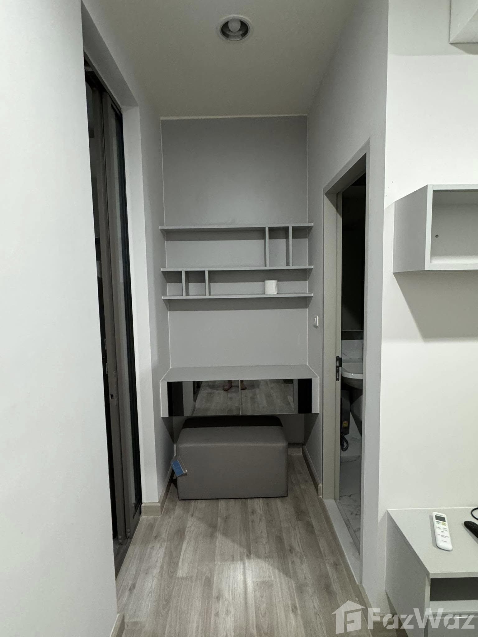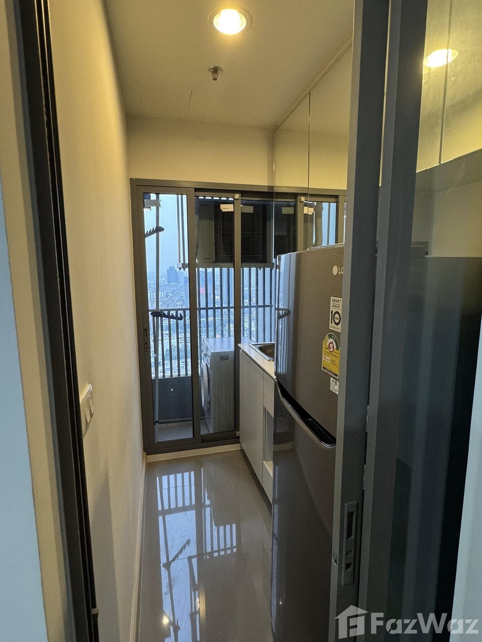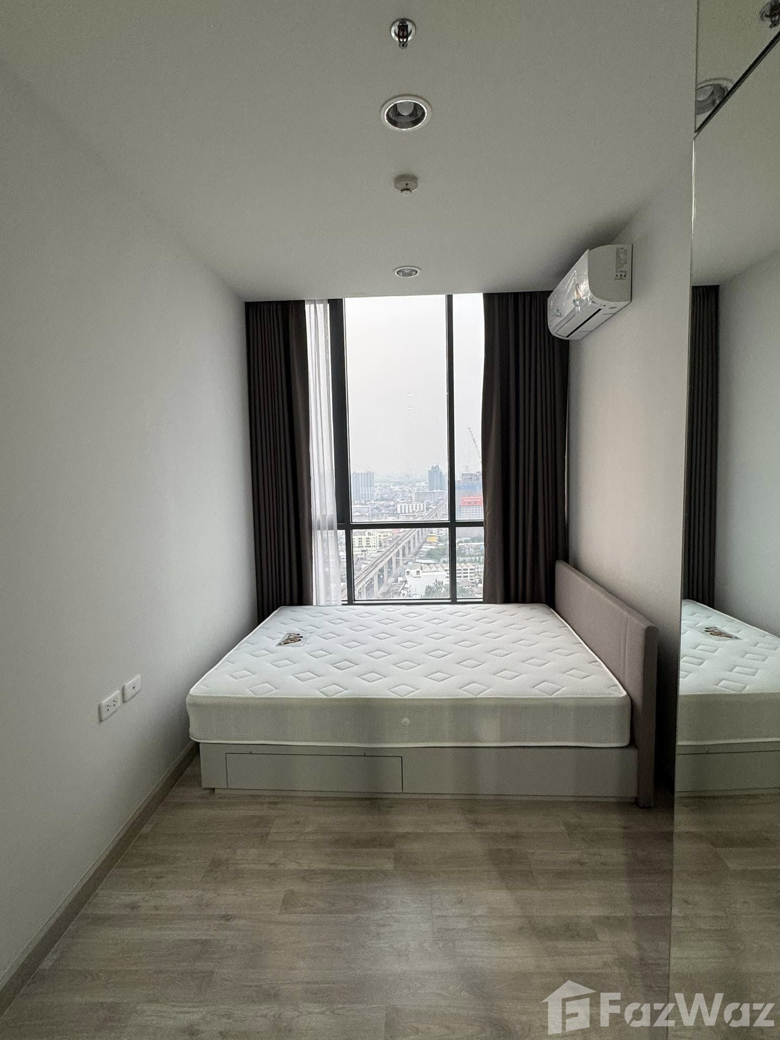 Exquisite Urban Living at Niche Pride Taopoon-Interchange Discover a blend of comfort and style in this 1-bedroom condo located on the 29th floor of the Niche Pride Taopoon-Interchange. Situated in the vibrant Bang Sue district of Bangkok, this residence offers an impressive living experience for those seeking modern city living. Interior Features Spread over 28 sqm, the condo features wooden flooring throughout, exuding warmth and elegance. The living room is equipped with a sleek gray sofa, flat-screen TV, and a TV console, perfect for relaxed evenings. Glass sliding doors not only ensure seamless access to the bedroom but also provide ample natural light. The bedroom is a sanctuary of comfort, highlighted by a large window showcasing captivating urban vistas. It includes a double bed, gray curtains, and a mirrored wall which enhances the spacious feel of the room. Functional and Elegant Spaces