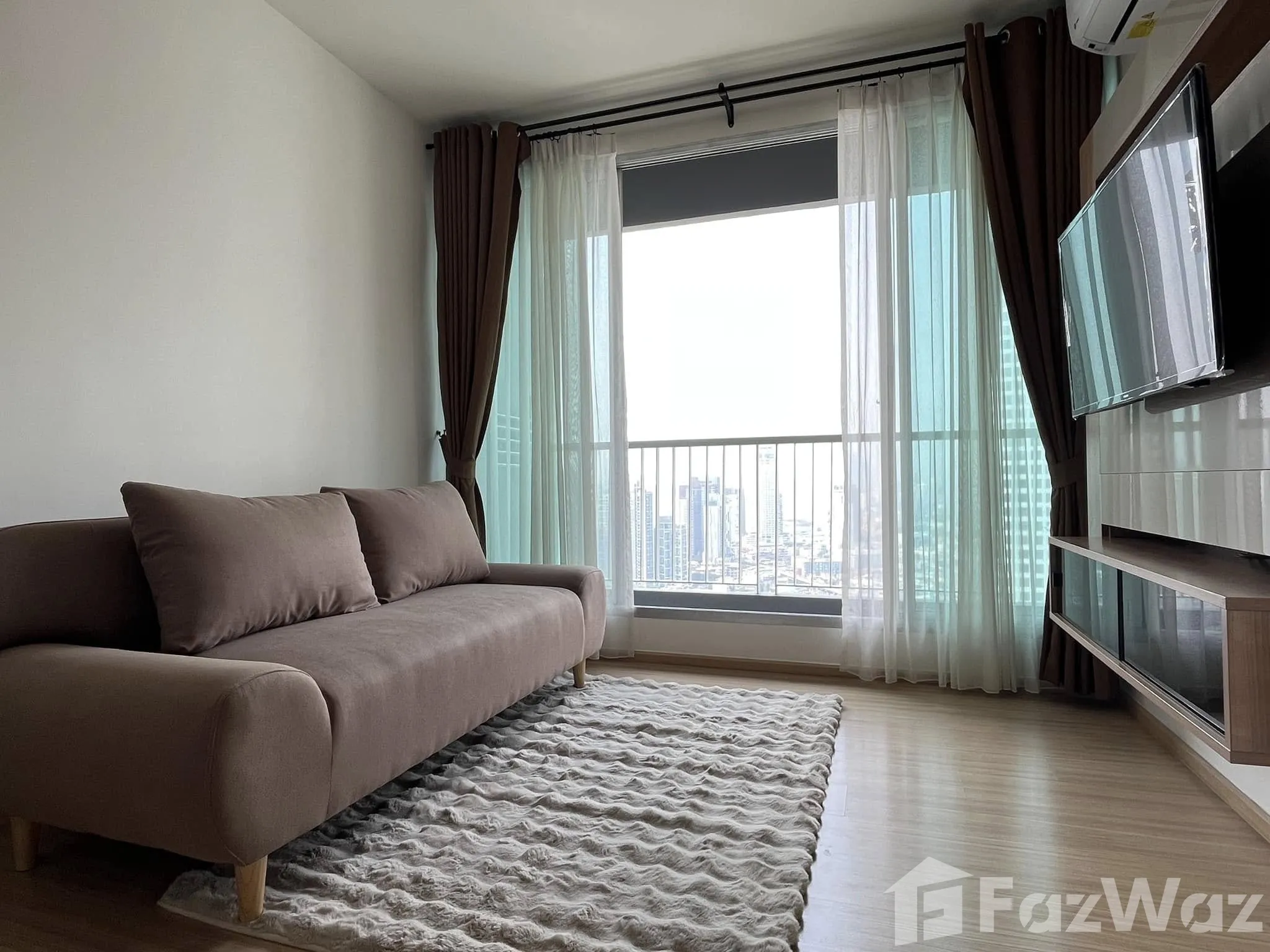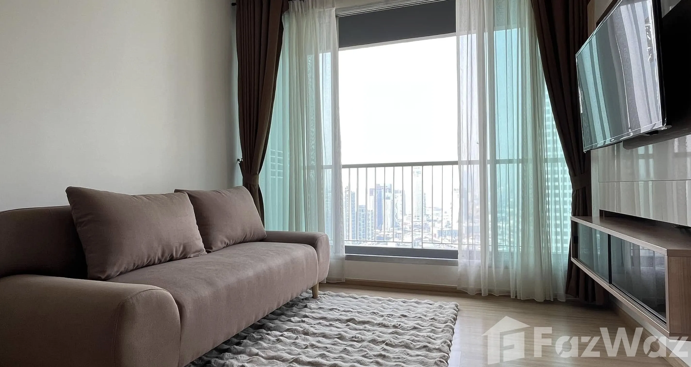 Welcome to Rhythm Sukhumvit 50 Experience luxury living in this exquisite 1-bedroom condo situated on the 35th floor of the esteemed Rhythm Sukhumvit 50 in the heart of Bang Chak, Phra Khanong, Bangkok. This property offers a perfect blend of comfort and elegance, making it an ideal home for discerning tenants. Stunning Living Space Step into a beautifully designed living room featuring large windows that offer captivating city views, allowing natural light to flood the space. The room is furnished with a plush brown sofa, a television, and an inviting area rug, all set on sleek wooden flooring that exudes warmth. Modern Kitchen The modern kitchen is thoughtfully equipped with integrated appliances, dark wood cabinetry, and a chic kitchen island. Enjoy meals at the dining table in an environment characterized by minimalist decor and a touch of sophistication. Comfortable Bedroom The spacious bedroom, complete with a double bed and wall-mounted television, ensures restful nights. A glass partition elegantly separates the bedroom from the bathroom, enhancing the condo's modern feel. Convenient Amenities Enhance your lifestyle with in-unit amenities, including a dedicated laundry area with a front-loading washing machine. Conveniently located in a vibrant neighborhood, this condo is available for rent at an attractive price of 30,000 THB.