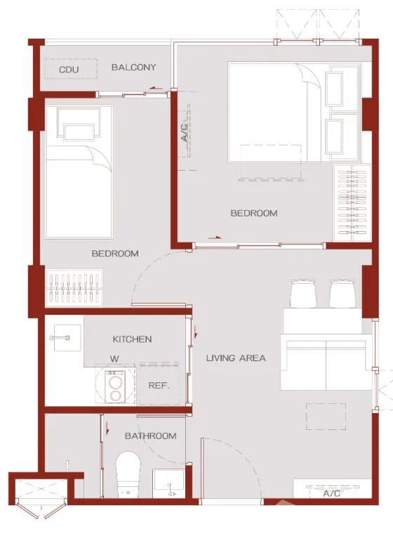 🔸ตึก A ชั้น 8 แบบ 2 ห้องนอน/1 ห้องน้ำ/1 ห้องนั่งเล่น
