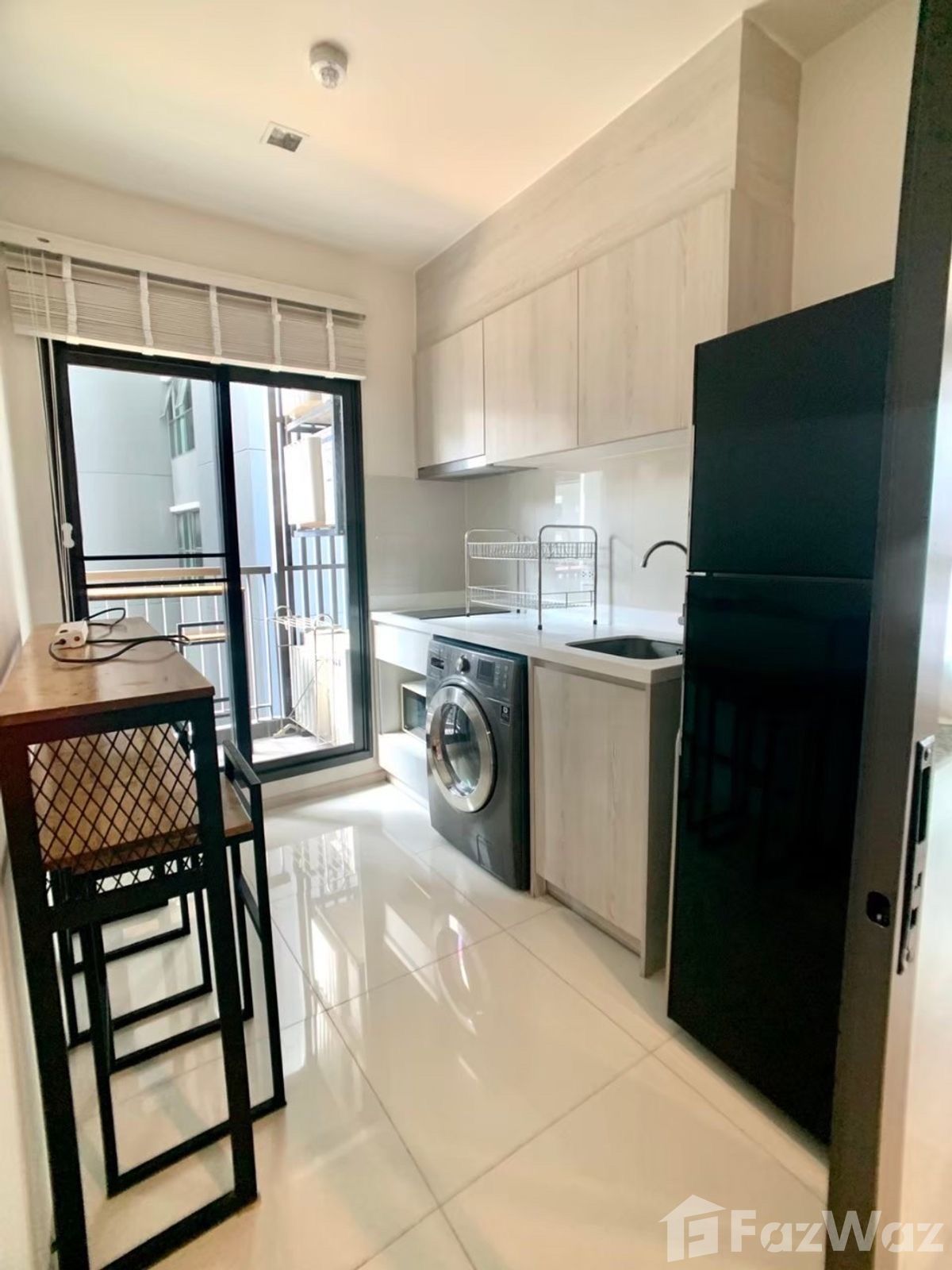 • The modern kitchen boasts sleek cabinets, a stainless steel sink, and comes complete with a black refrigerator and washing machine.