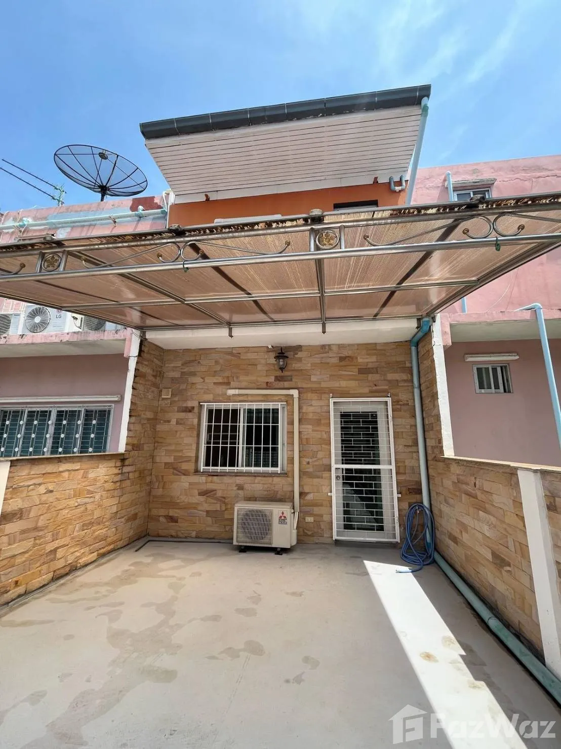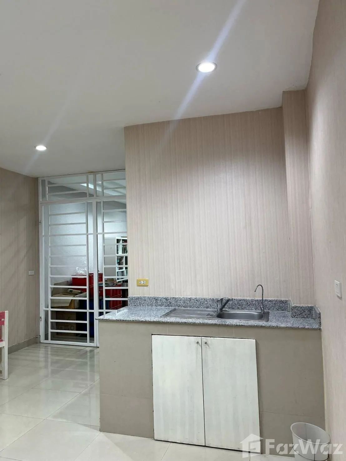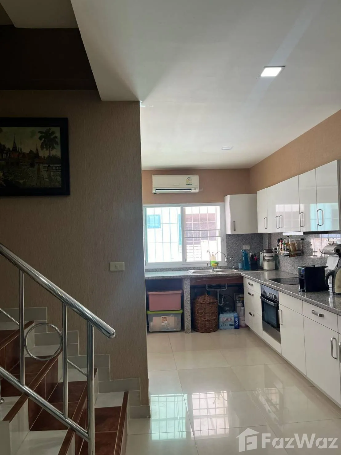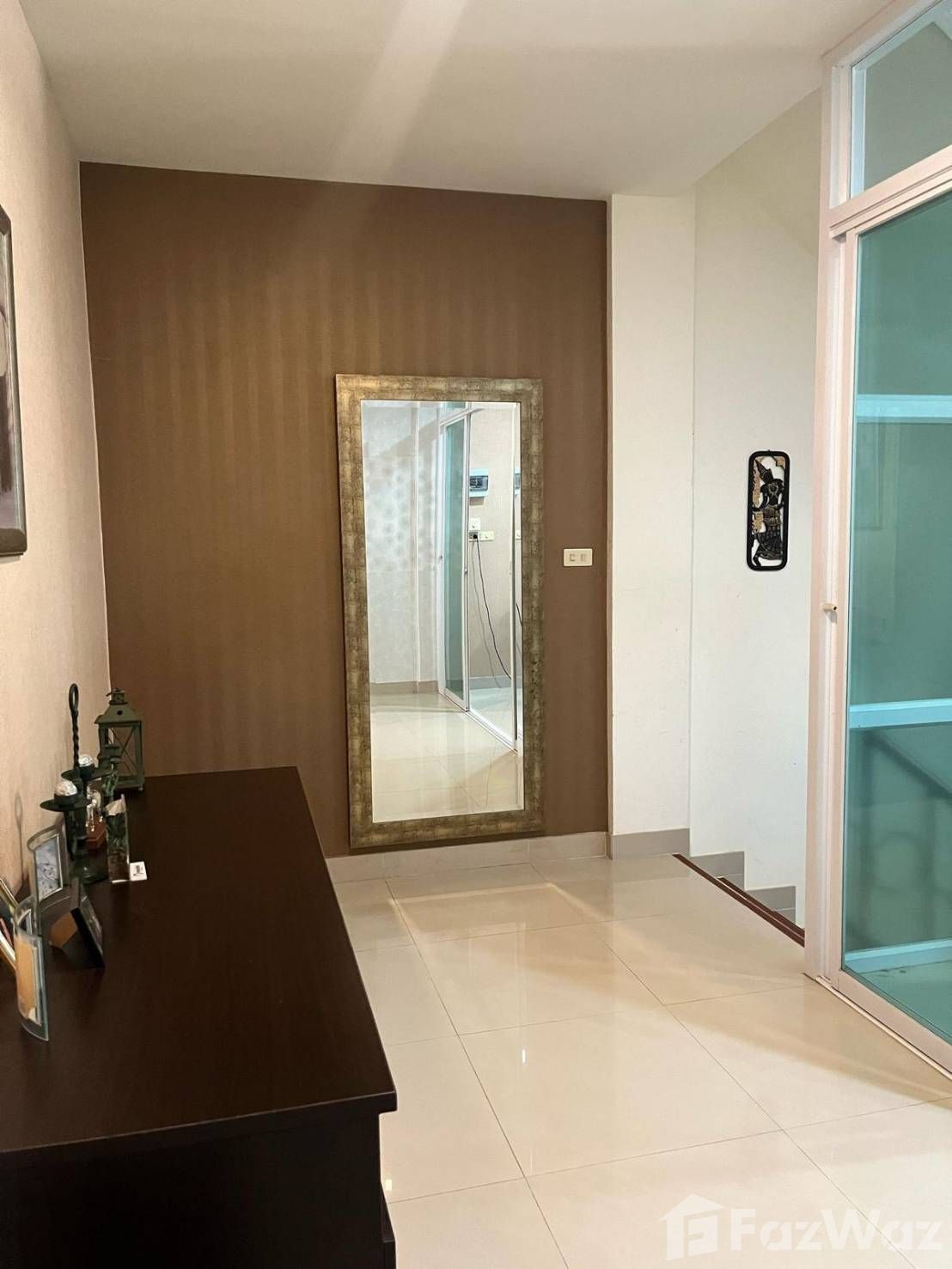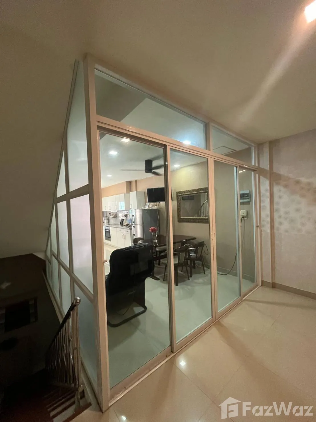 มีระเบียง  โถงด้านล่างมีเคาน์เตอร์ กั้นกระจก 3 ช่วง บ้านพร้อมเฟอร์นิเจอร์ใกล้ตลาดนัดไดโนเสาร์ใหม่ ห้าง DIY ห่างเซเว่น 100 เมตร