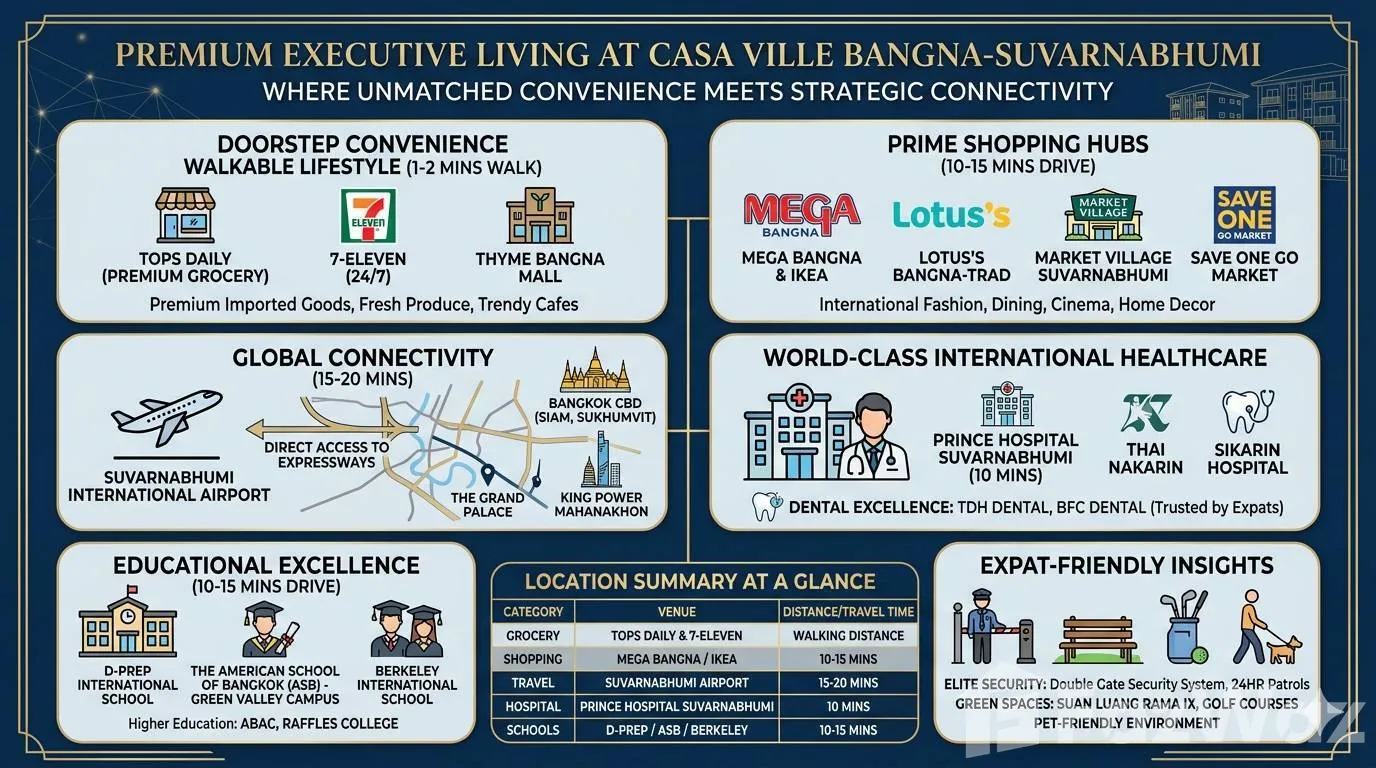 Unbeatable Connectivity (Prime Location): Ultimate Convenience: Only 5 minutes to Tops Supermarket, local fresh markets, a variety of restaurants, and car care services. Shopping Destination: Close proximity to Mega Bangna and IKEA Bangna. Airport Access: Quick and easy commute to Suvarnabhumi International Airport.