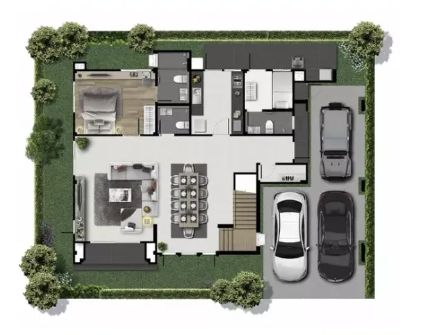 บ้านเดี่ยวแบบ Angelo ขนาดที่ดินเริ่มต้น 64.5 ตร.วา พื้นที่ใช้สอย 303 ตารางเมตร 4 ห้องนอน 5 ห้องน้ำ 2 ห้องอเนกประสงค์ 3 ที่จอดรถ