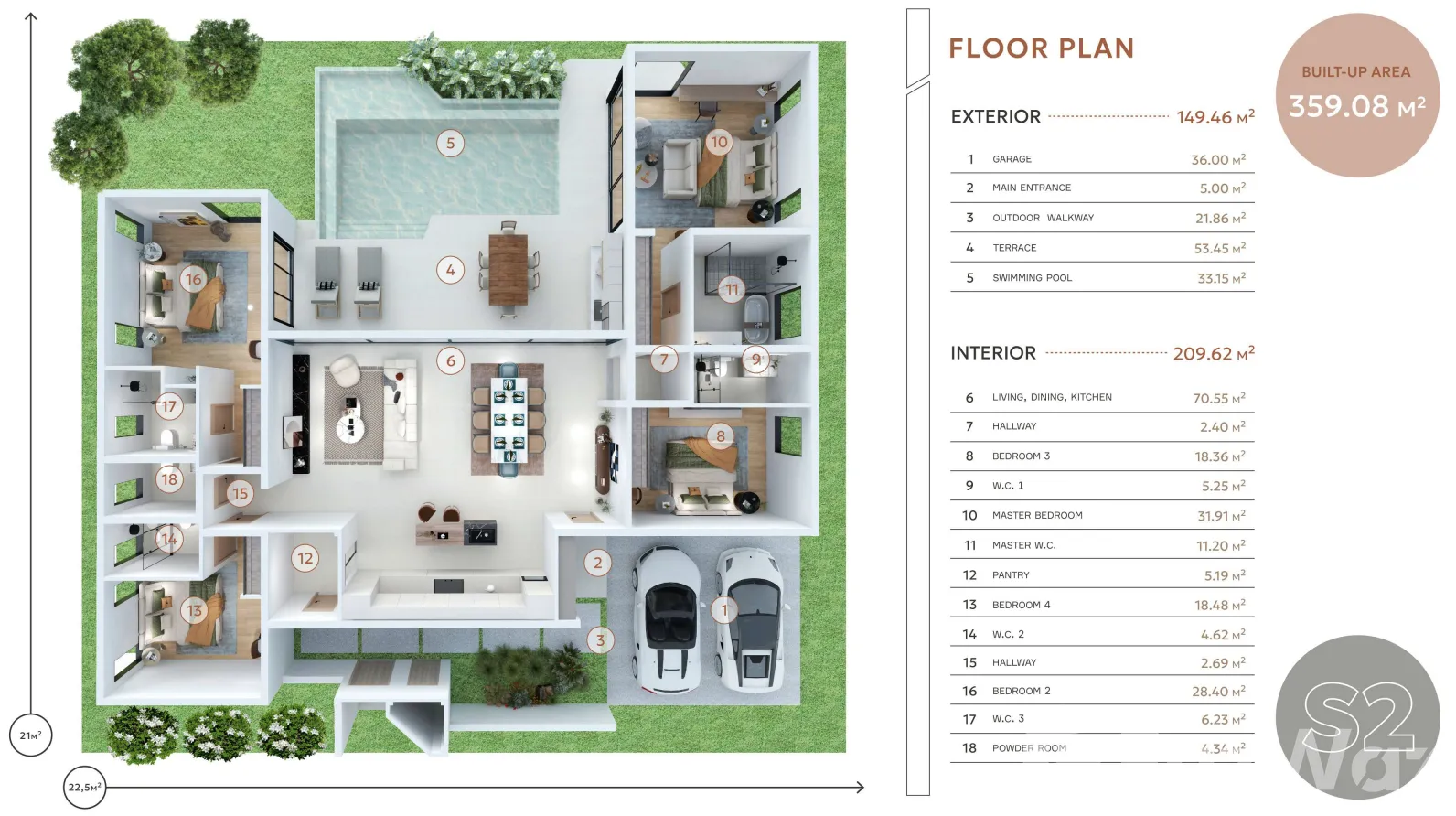 เป็นการรวมขนาดของพื้นที่ก่อสร้างภายนอก เช่น สระว่ายน้ำ, ชานบ้าน, ที่จอดรถ และ ศาลา แต่จะไม่รวมพื้นที่สวนเข้าไปด้วย
