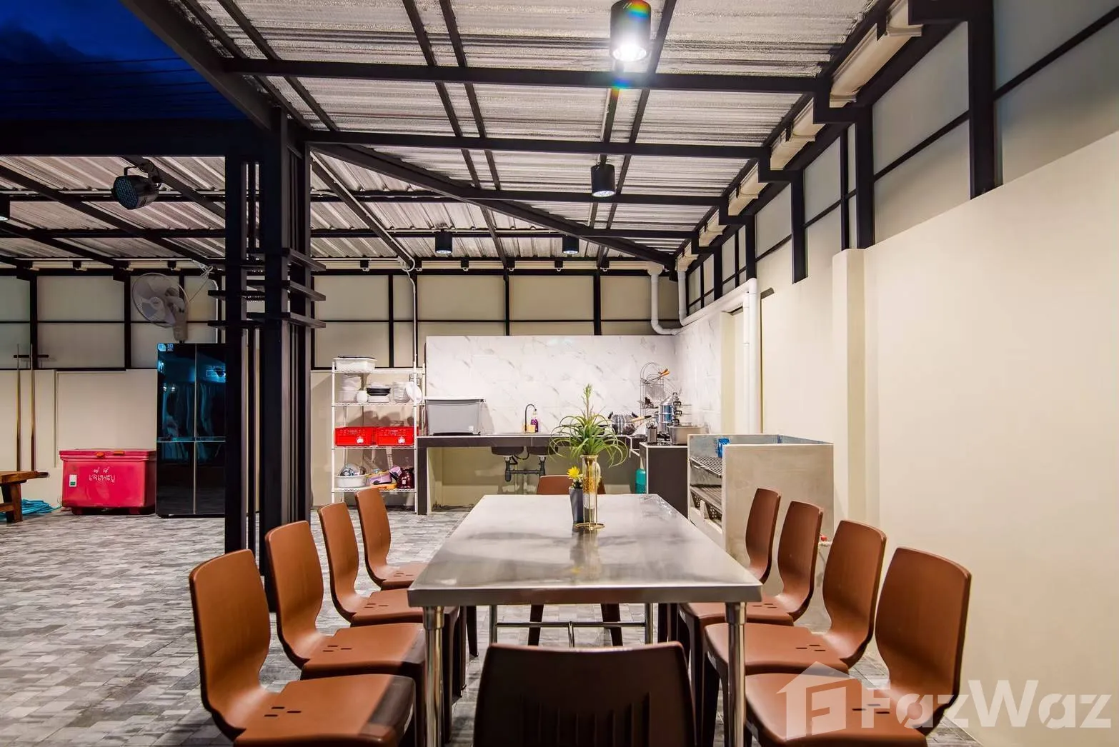 ห้องครัวใหญ่ พร้อมอุปกรณ์ทำครัวครบชุด (หม้อ, กระทะ, จาน, ชาม, ช้อน, หม้อหุงข้าว, มีด)(ลูกค้าต้องทำความสะอาดหลังใช้งาน หากไม่สะดวก คิดค่าบริการ 1,000 บาท)