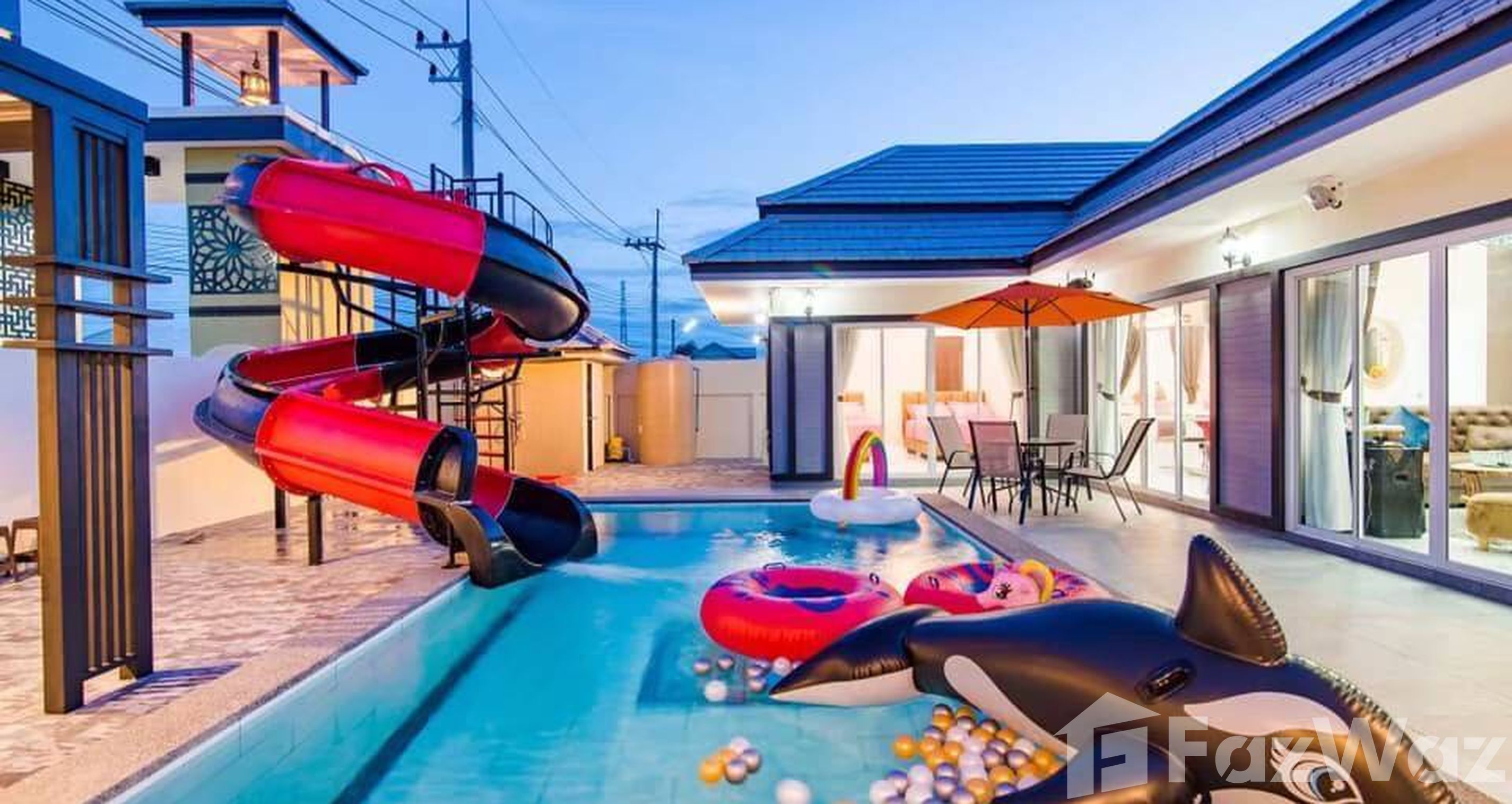 พูลวิลล่าหรู 5 ห้องนอน 3 ห้องน้ำ ให้เช่าในหัวหิน เหมาะสำหรับครอบครัวหรือหมู่คณะ บ้านพูลวิลล่าหลังใหญ่สุดหรู ขนาด 5 ห้องนอน 3 ห้องน้ำ บนเนื้อที่ 117 ตารางวา ตกแต่งภายในสวยหรู ครบครันทั้งความสะดวกและความบันเทิง เหมาะสำหรับครอบครัวใหญ่หรือกลุ่มเพื่อนที่ต้องการพักผ่อนในบรรยากาศส่วนตัว สิ่งอำนวยความสะดวก:
