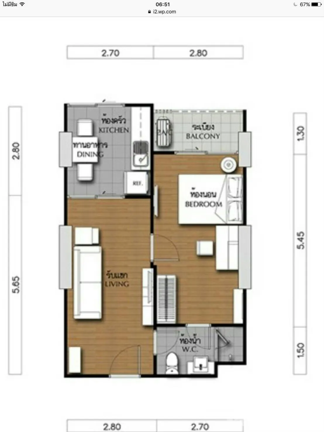ขนาด 1 ห้องนอน 1 ห้องน้ำ พื้นที่ 37 ตร.ม. ชั้น 12