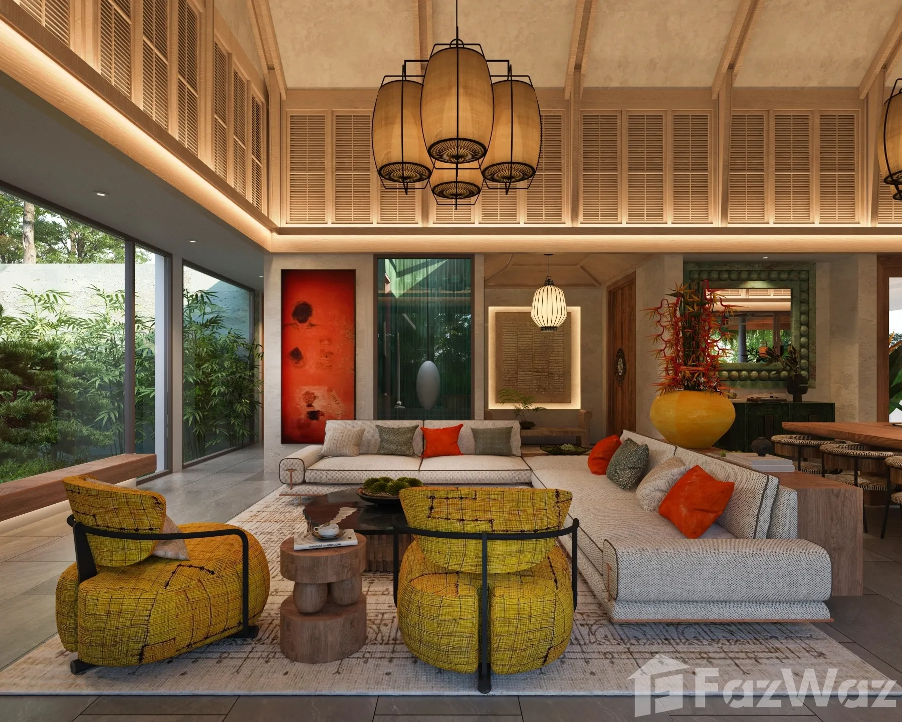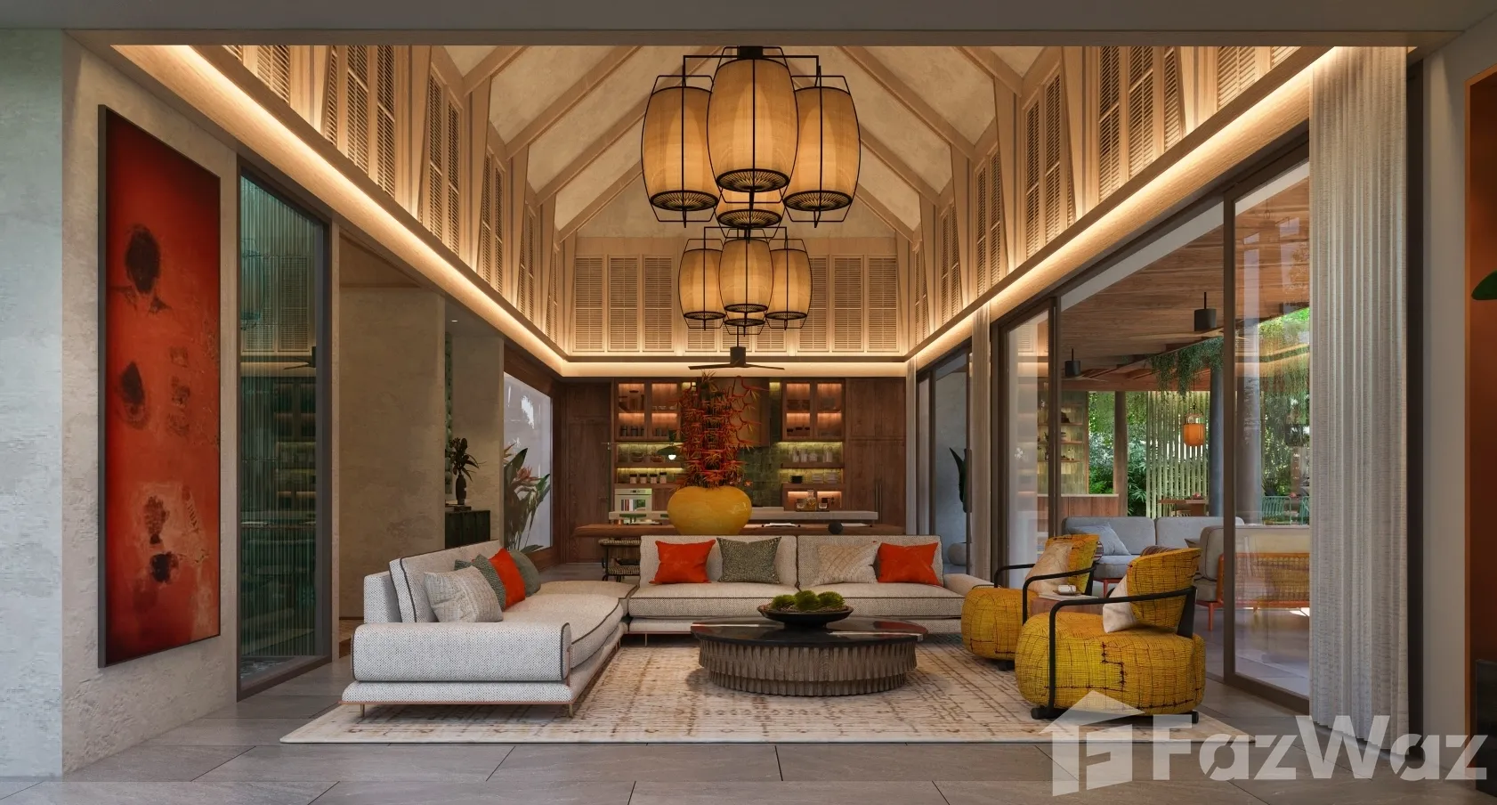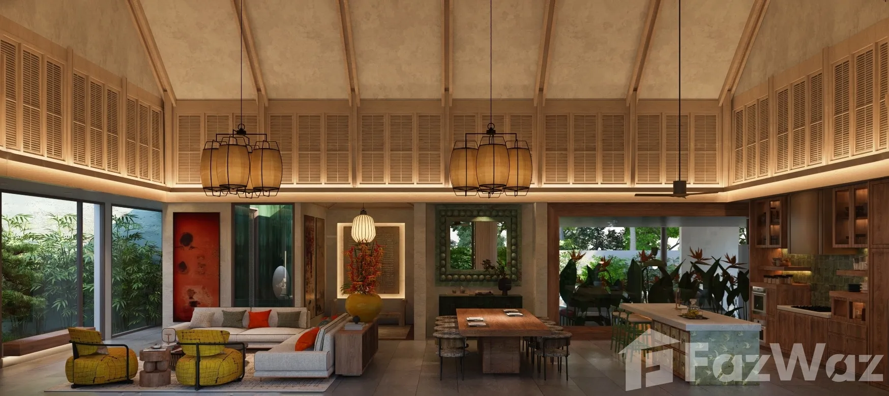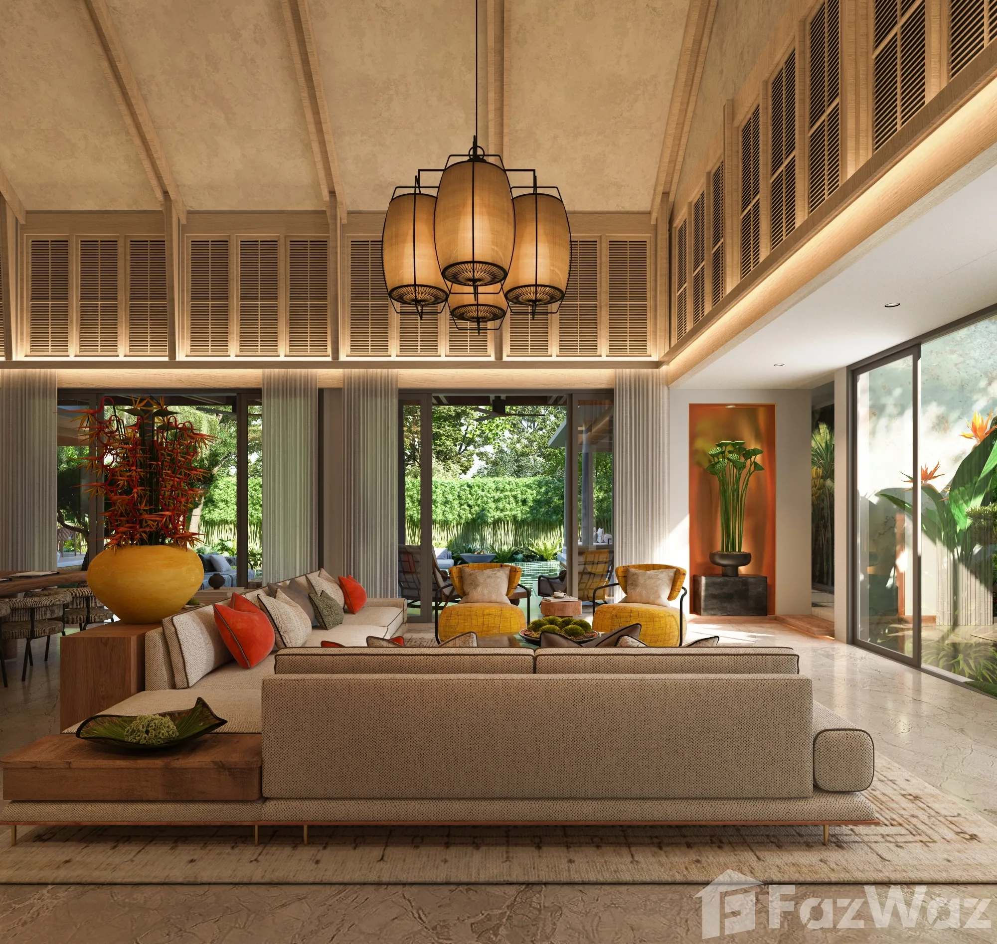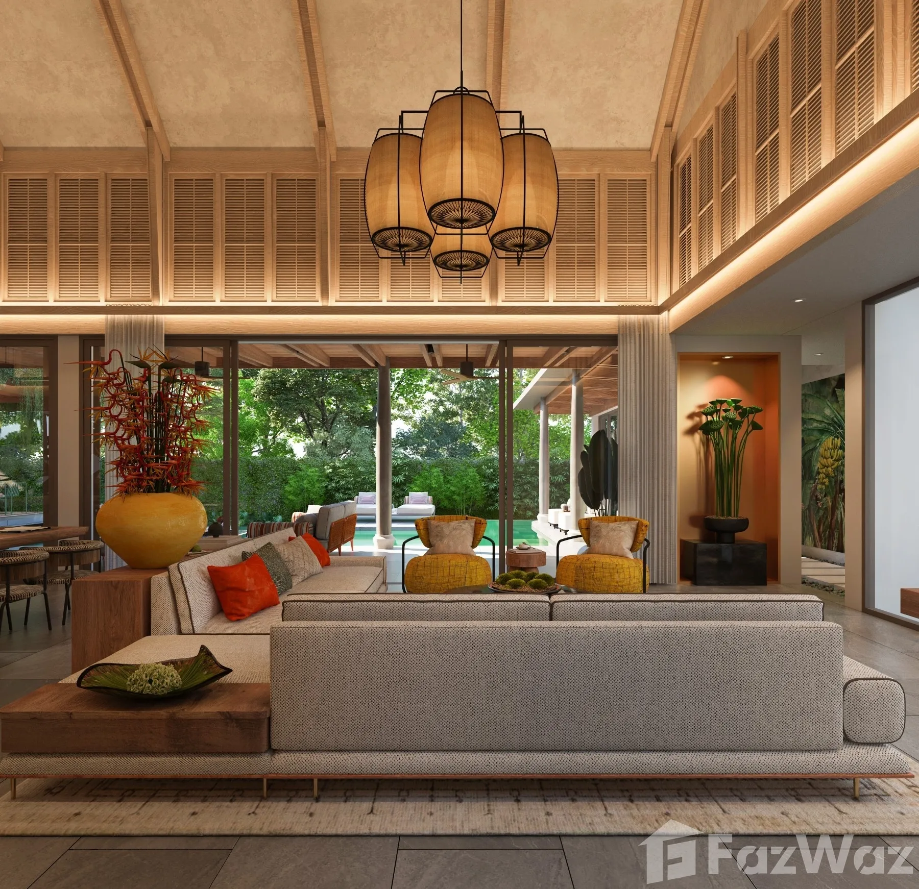 พื้นที่อยู่อาศัยภายในโดดเด่นด้วยเพดานสูงแบบโถง พร้อมคานไม้เปลือย ช่วยเพิ่มความโปร่ง โล่ง และให้ความรู้สึกเหมือนรีสอร์ทระดับหรู หน้าต่างกระจกบานใหญ่จากพื้นจรดเพดานเปิดรับแสงธรรมชาติและวิวสวนสีเขียว เชื่อมต่อพื้นที่ภายในและภายนอกอย่างไร้รอยต่อ ห้องนอนและห้องน้ำได้รับแรงบันดาลใจจากธรรมชาติและงานหัตถศิลป์ท้องถิ่น เลือกใช้วัสดุอย่างไม้สักไทยและเพดานไม้โอ๊ค ซึ่งสะท้อนเสน่ห์ของบ้านสไตล์โคโลเนียลในภูเก็ต