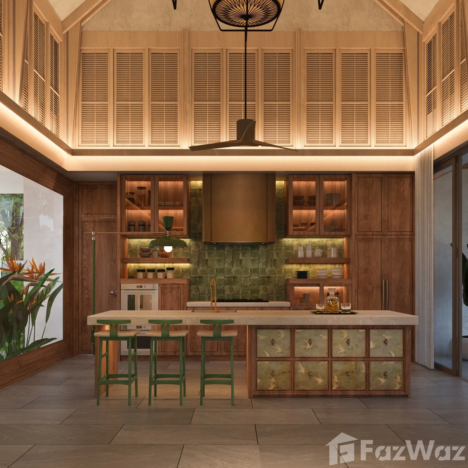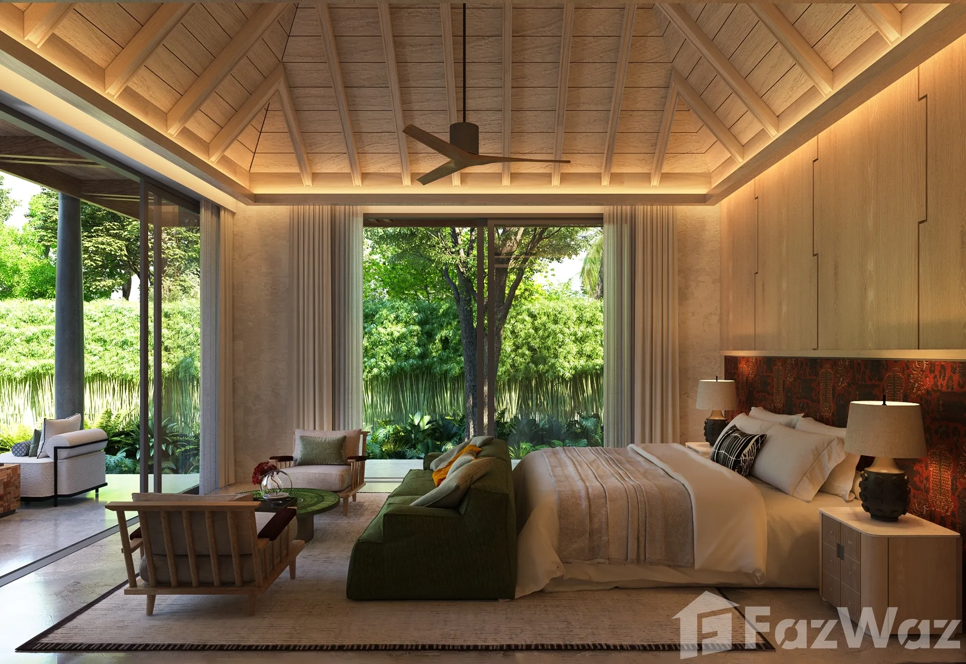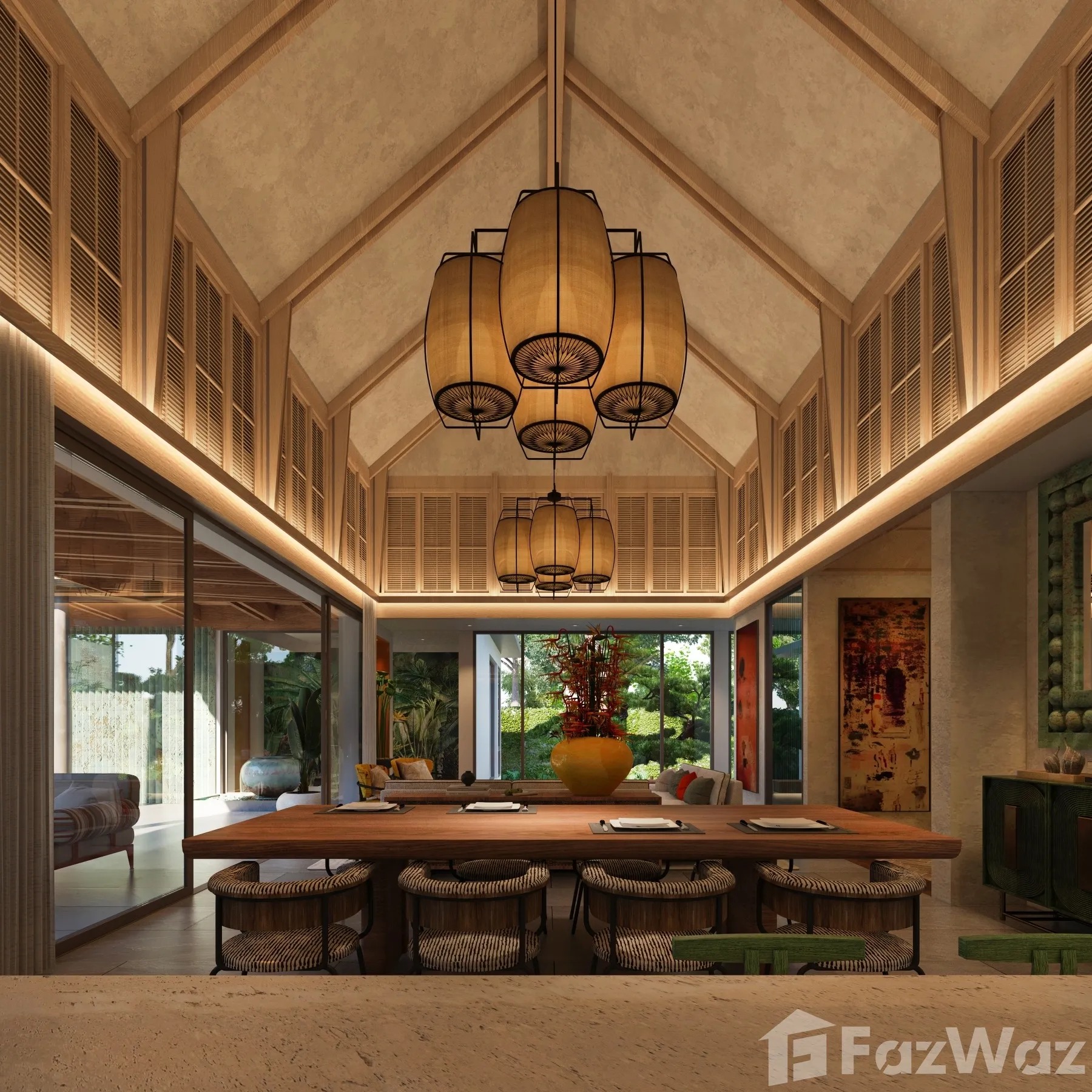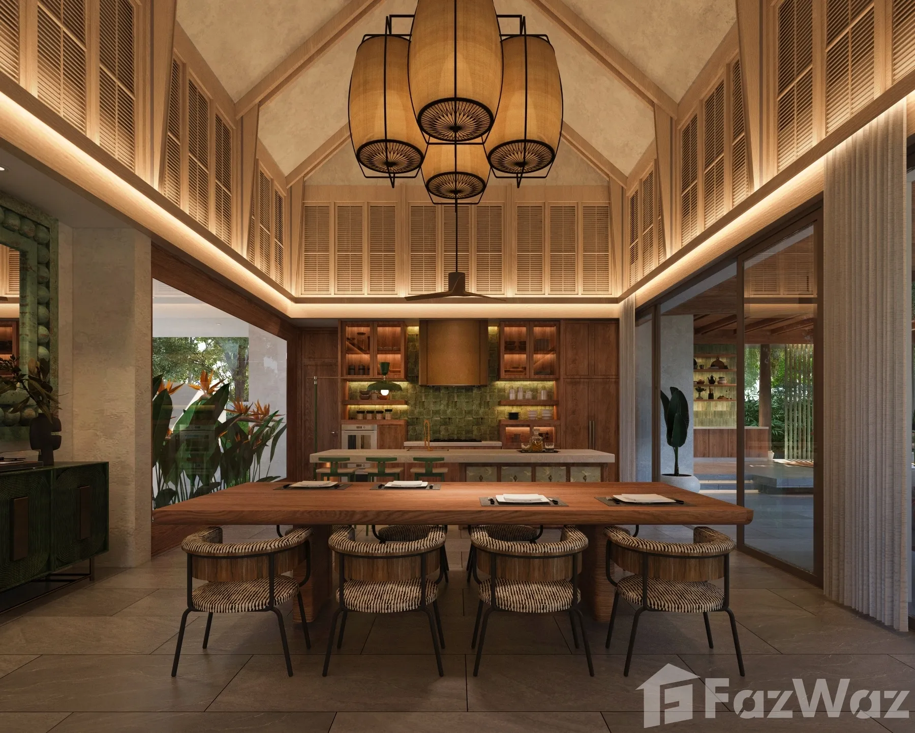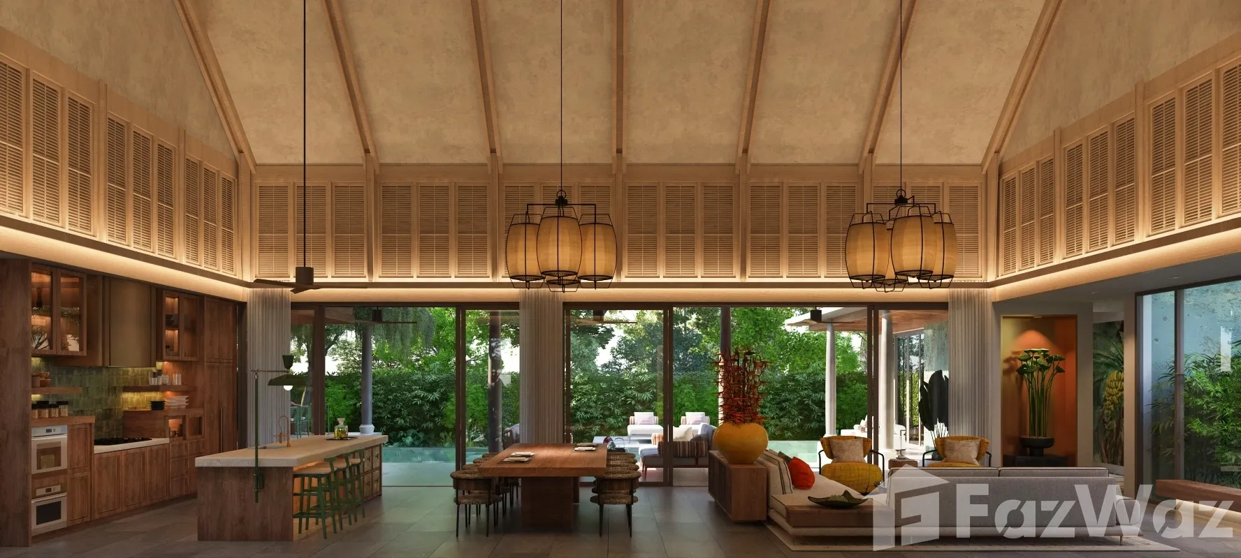 พื้นที่อยู่อาศัยภายในโดดเด่นด้วยเพดานสูงแบบโถง พร้อมคานไม้เปลือย ช่วยเพิ่มความโปร่ง โล่ง และให้ความรู้สึกเหมือนรีสอร์ทระดับหรู หน้าต่างกระจกบานใหญ่จากพื้นจรดเพดานเปิดรับแสงธรรมชาติและวิวสวนสีเขียว เชื่อมต่อพื้นที่ภายในและภายนอกอย่างไร้รอยต่อ ห้องนอนและห้องน้ำได้รับแรงบันดาลใจจากธรรมชาติและงานหัตถศิลป์ท้องถิ่น เลือกใช้วัสดุอย่างไม้สักไทยและเพดานไม้โอ๊ค ซึ่งสะท้อนเสน่ห์ของบ้านสไตล์โคโลเนียลในภูเก็ต