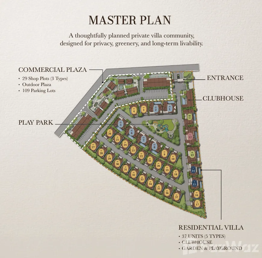 โครงการตั้งอยู่บนพื้นที่ประมาณ 13 ไร่ มีเพียง 37 ยูนิต มอบความเป็นส่วนตัวและความเอ็กซ์คลูซีฟให้กับผู้อยู่อาศัย ตัวบ้านเป็นบ้านเดี่ยว 1–2 ชั้น พื้นที่ใช้สอยกว้างขวาง ประกอบด้วย 3–4 ห้องนอน พร้อมสระว่ายน้ำส่วนตัว พื้นที่นั่งเล่นขนาดใหญ่ และพื้นที่ภายนอกที่จัดสวนอย่างสวยงามเพื่อให้กลมกลืนกับธรรมชาติ