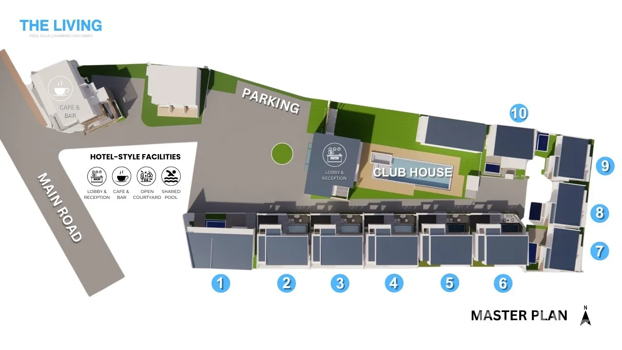 โครงการตั้งอยู่ภายใน The Living Pool Villas Hotel Project ทำให้ผู้อยู่อาศัยได้สัมผัสความเป็นส่วนตัวของวิลล่าเดี่ยว พร้อมสิ่งอำนวยความสะดวกระดับโรงแรมครบครัน ไม่ว่าจะเป็นคาเฟ่และบาร์ โซนล็อบบี้ สระว่ายน้ำส่วนกลางขนาด 25 เมตร คอร์ทยาร์ด และพื้นที่จอดรถกว้างขวาง