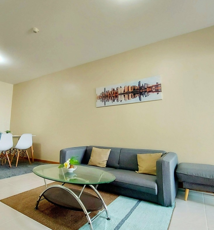 เตียง + ที่นอน, TV, เครื่องทำน้ำอุ่น, แอร์ 2 เครื่อง, โซฟา, โต๊ะกระจก, โต๊ะทานข้าว + เก้าอี้, ชั้นวางของ, ตู้แขวน, เคาน์เตอร์ครัว