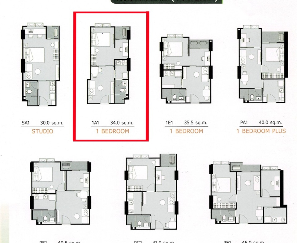 ห้องขนาด 34 ตร.ม. 1 ห้องนอน 1 ห้องน้ำ