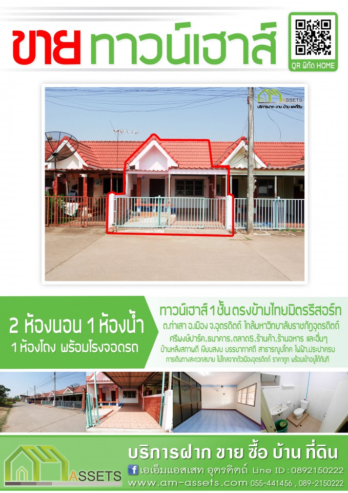 ทาวน์เฮาส์ 1 ชั้น 2 ห้องนอน 1 ห้องน้ำ พร้อมห้องรับแขก,ห้องครัว และโรงจอดรถในตัวบ้าน เนื้อที่ 25 ตรว. บ้านหนองคำฮ๊อย(ตรงข้ามโรงแรมไทยมิตร) ต.ท่าเสา อ.เมืองอุตรดิตถ์ ทาวน์เฮาส์1ชั้น สภาพดี แต่งสวย พร้อมเข้าอยู่ได้ทันที เข้าออกสะดวกสบายติดถนนคอนกรีตขนาดใหญ่ เข้าจากถนนใหญ่เพียง 50 เมตรเท่านั้น เหมาะสำหรับพักอาศัยหรือซื้อเพื่อปล่อยเช่า ใกล้มหาวิทยาลัยราชภัฎอุตรดิตถ์, วัดอรัญ, ร้านค้า, ร้านอาหาร, ศรีพงษ์ปาร์ค, ธนาคาร,โรงเรียน และอื่นๆ สาธารณูปโภคครบ ไฟฟ้า,ประปา,ถนนคอนกรีต,อินเตอร์เน็ตความเร็วสูง แถมฟรี แอร์ 1 เครื่อง พัดลม 2 เครื่อง ผ้าม่าน, มุ้งลวด, เหล็กดัด