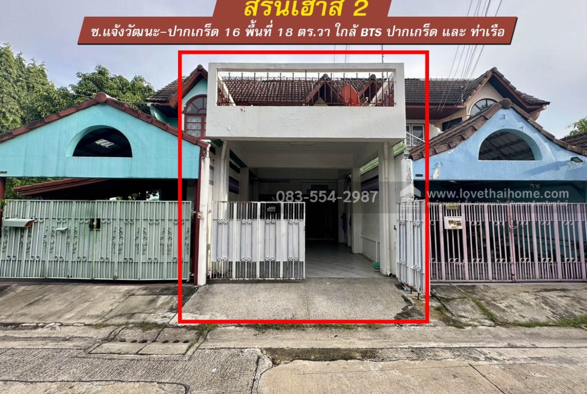 ขายทาวน์เฮ้าส์ 2 ชั้น 18 ตร.วา หมู่บ้านสิรินเฮ้าส์ 2 แจ้งวัฒนะ-ปากเกร็ด 16 ทะลุ แจ้งวัฒนะ-ปากเกร็ด 4 ได้ นนทบุรี สภาพสวย ต่อเติมครัว+ระเบียง+โรงรถ ใกล้แหล่งชุมชน-ตลาดปากเกร็ด เข้า-ออกได้หลายทาง ใกล้ BTS ปากเกร็ดและท่าเรือ