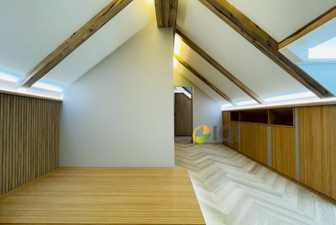 Attic with one wall-mounted air conditioner that can be used as a bedroom or office