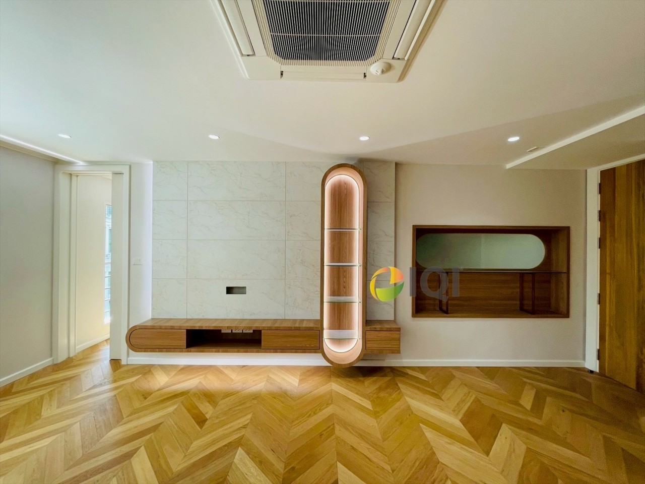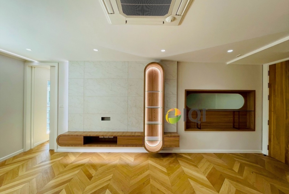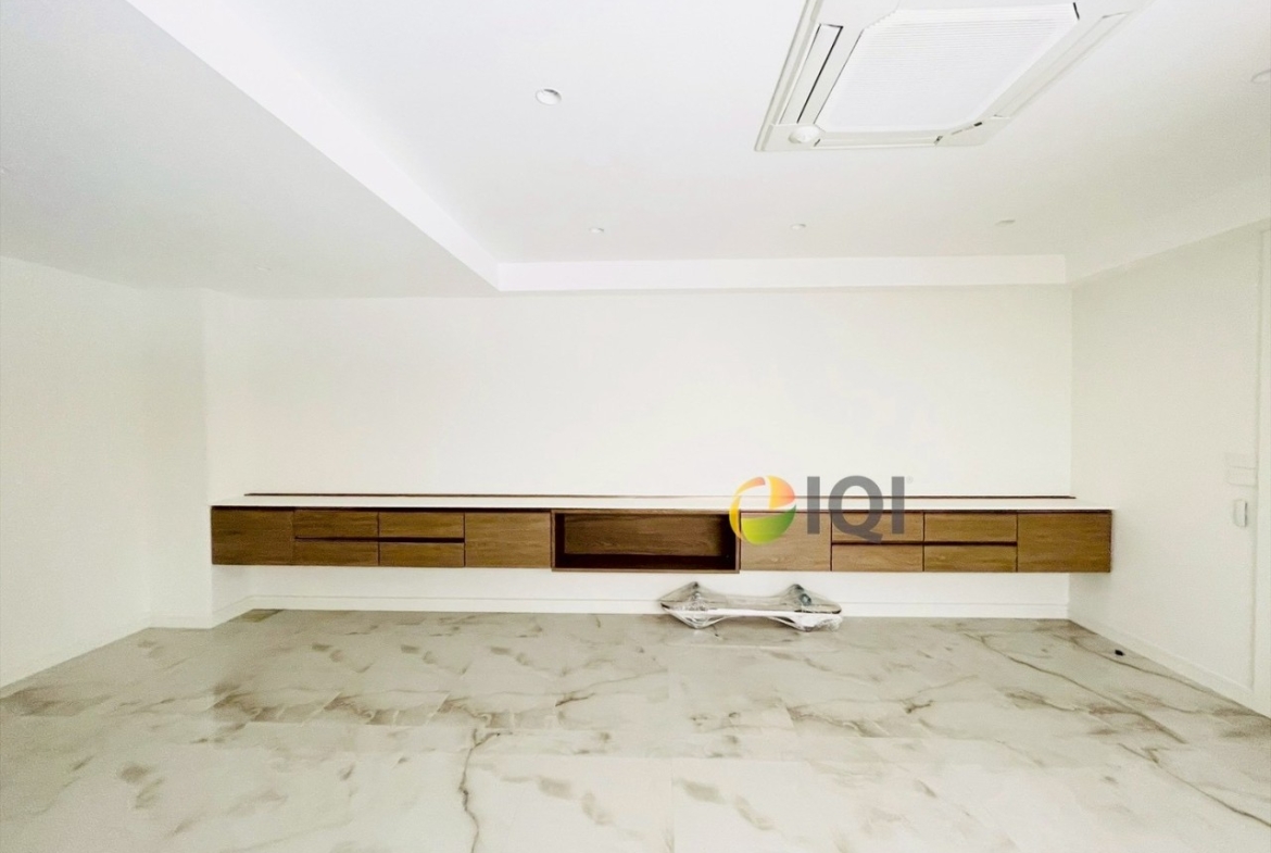 First Floor: Marble-patterned tiles, built-in TV cabinet, two cassette-type air conditioners, a built-in kitchen, and one bathroom.