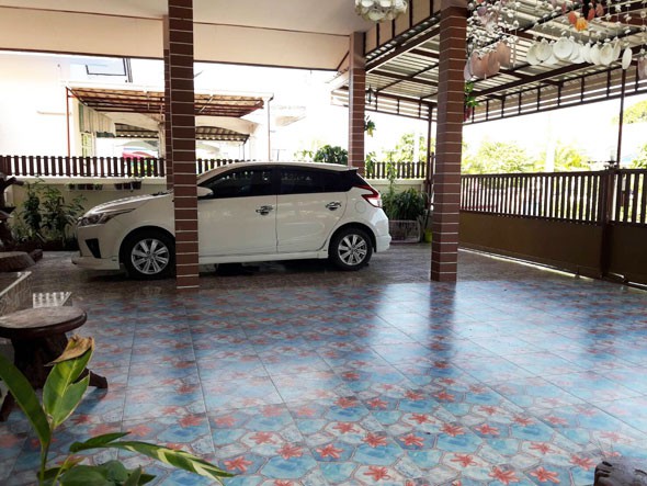 รั้วบ้านเปิดได้ 2 ด้าน จอดรถได้ 2 คัน โรงจอดรถต่อหลังคาเมทัสชีทเพิ่ม