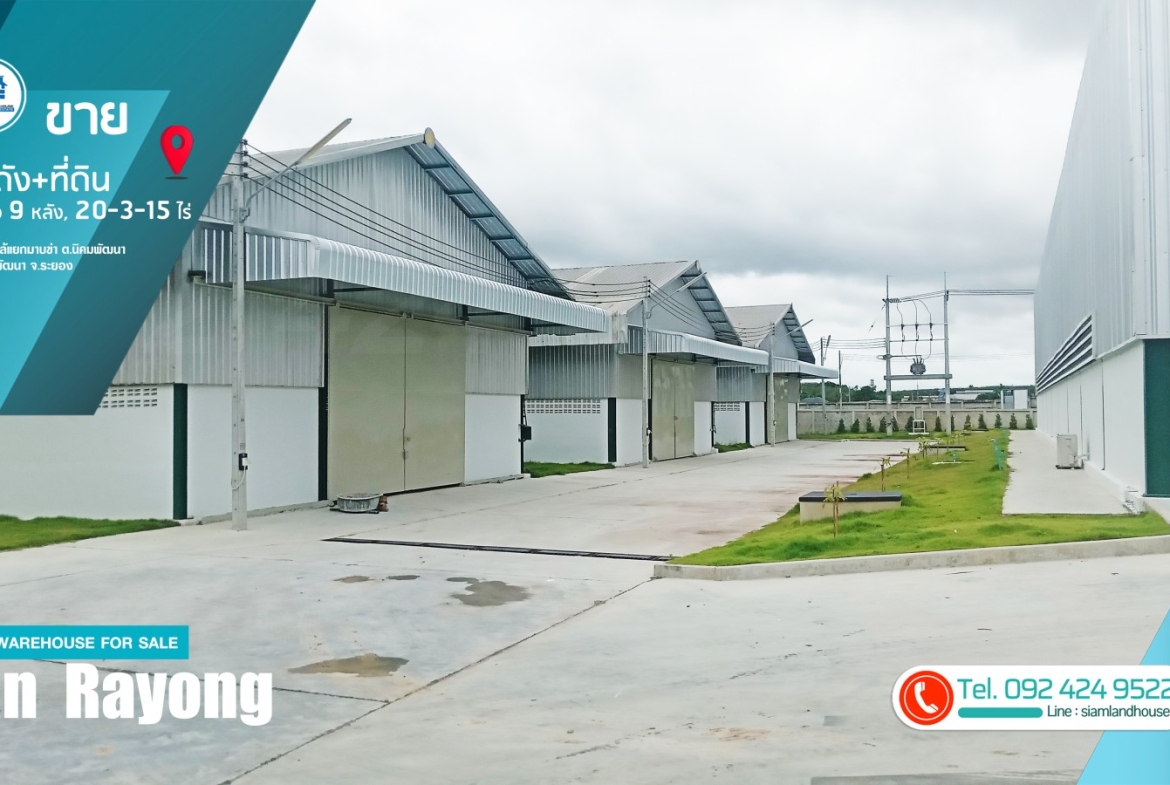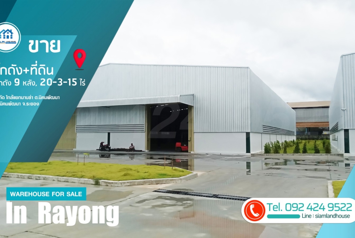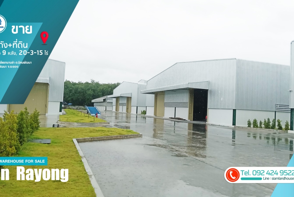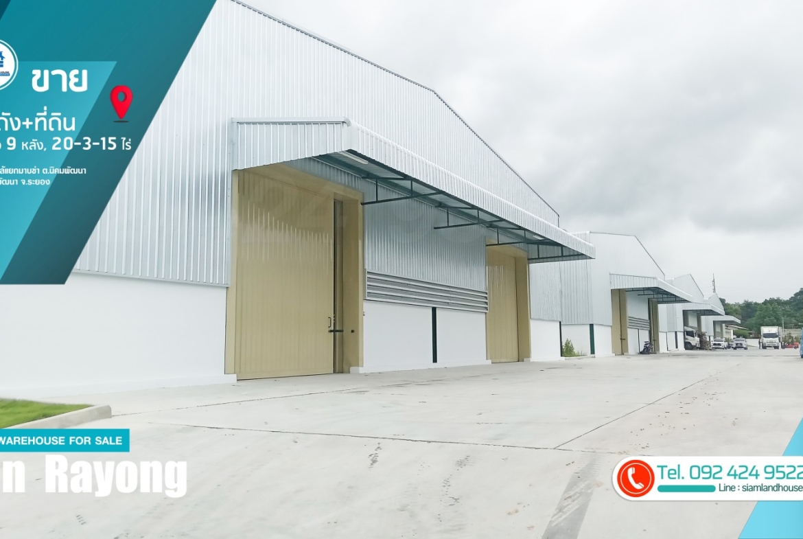 仓库 + 土地出售 20-3-15 莱,9 个仓库已满租户。距离 CPGC 工业区仅 6 公里,靠近罗勇府 Nikhom Phatthana 区 Nikhom Phatthana 街道 Mapkha 十字路口。