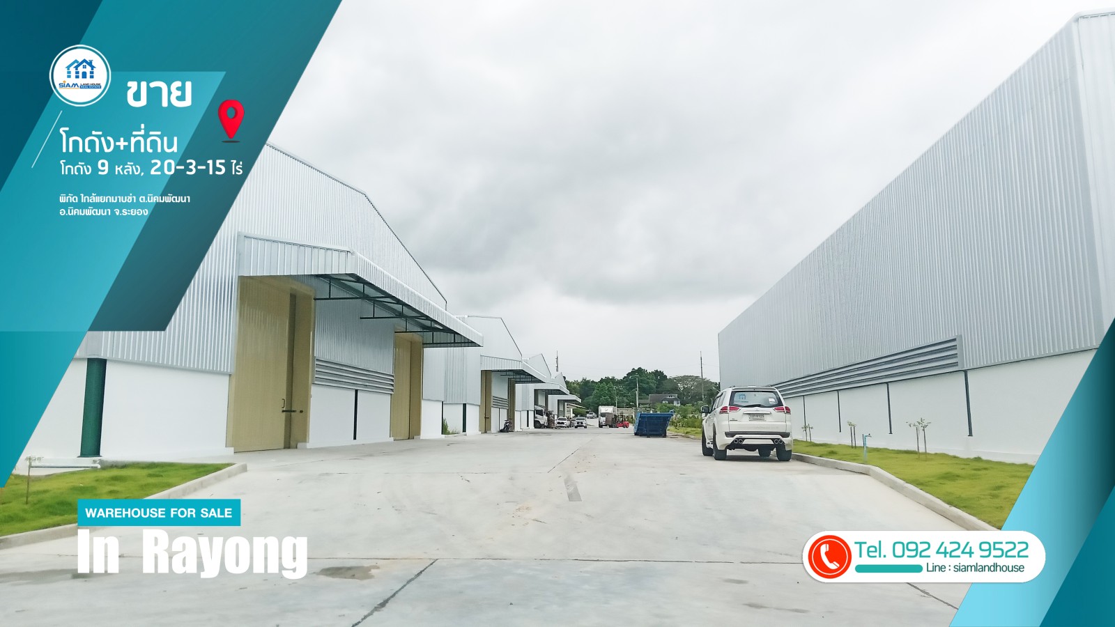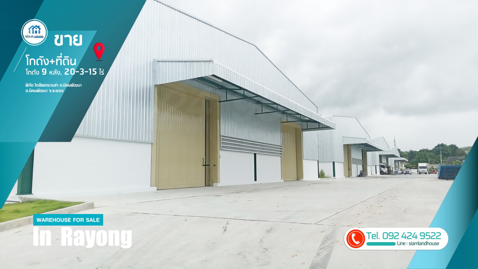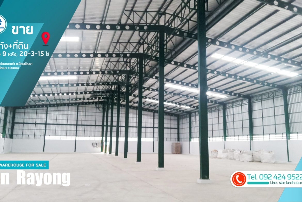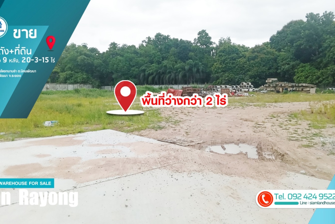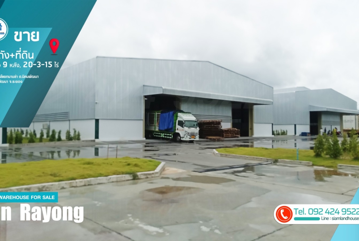仓库 + 土地出售 20-3-15 莱,9 个仓库已满租户。距离 CPGC 工业区仅 6 公里,靠近罗勇府 Nikhom Phatthana 区 Nikhom Phatthana 街道 Mapkha 十字路口。