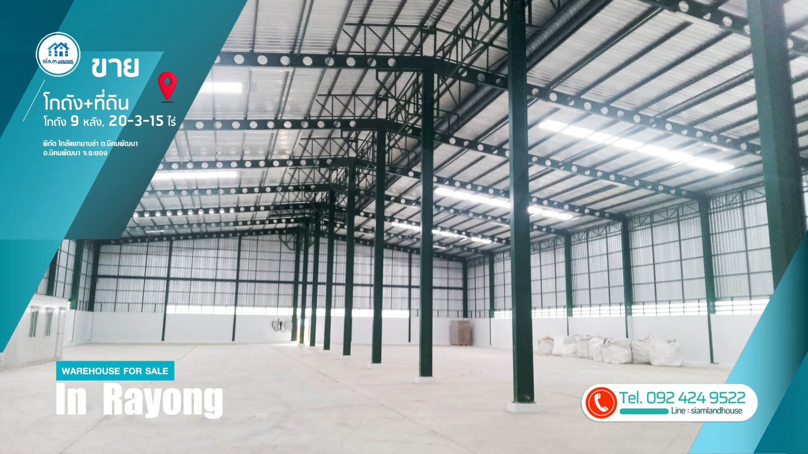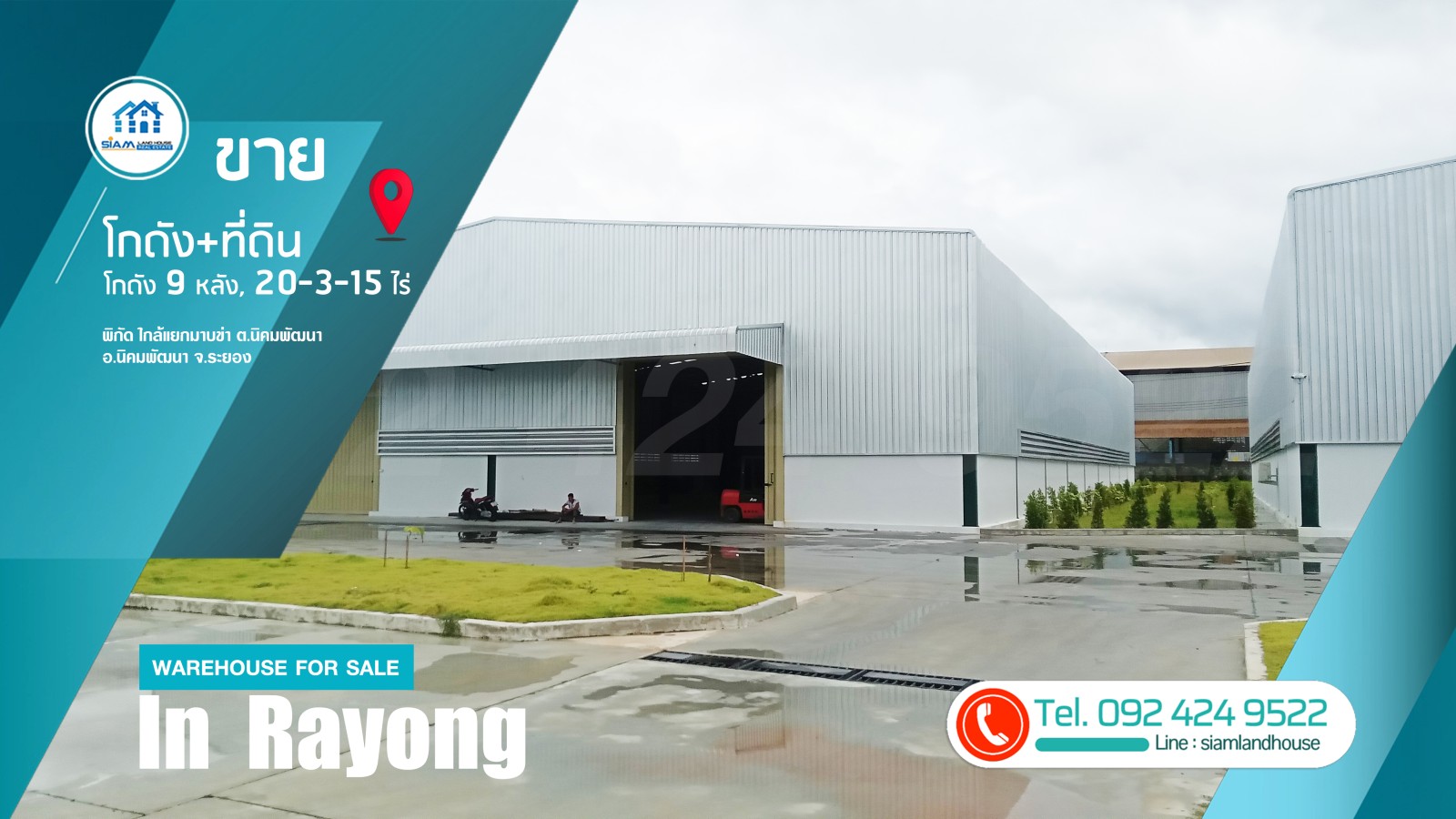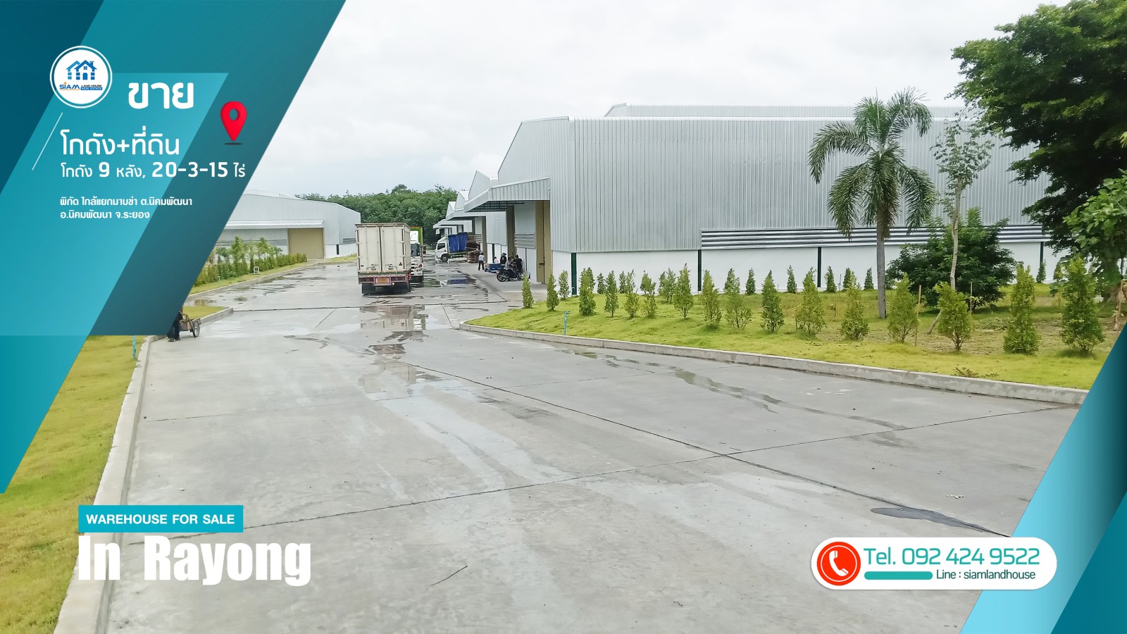 仓库 + 土地出售 20-3-15 莱,9 个仓库已满租户。距离 CPGC 工业区仅 6 公里,靠近罗勇府 Nikhom Phatthana 区 Nikhom Phatthana 街道 Mapkha 十字路口。