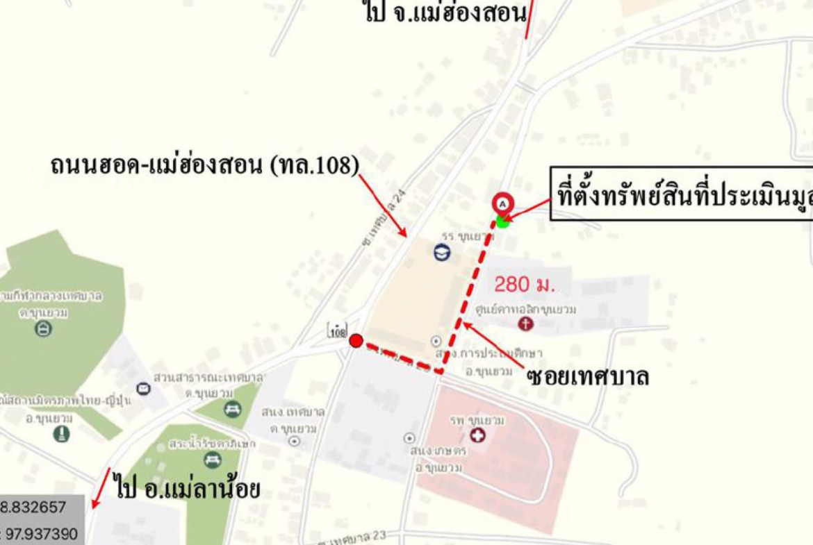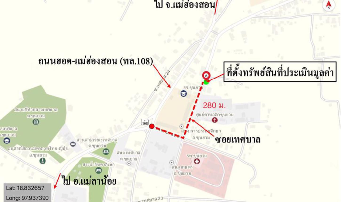 ที่ตั้งสินทรัพย์ : ซอย เทศบาล ถนน ฮอด – แม่ฮ่องสอน (ทล.108) ตำบล ขุนยวม อำเภอ ขุนยวม จังหวัด แม่ฮ่องสอน